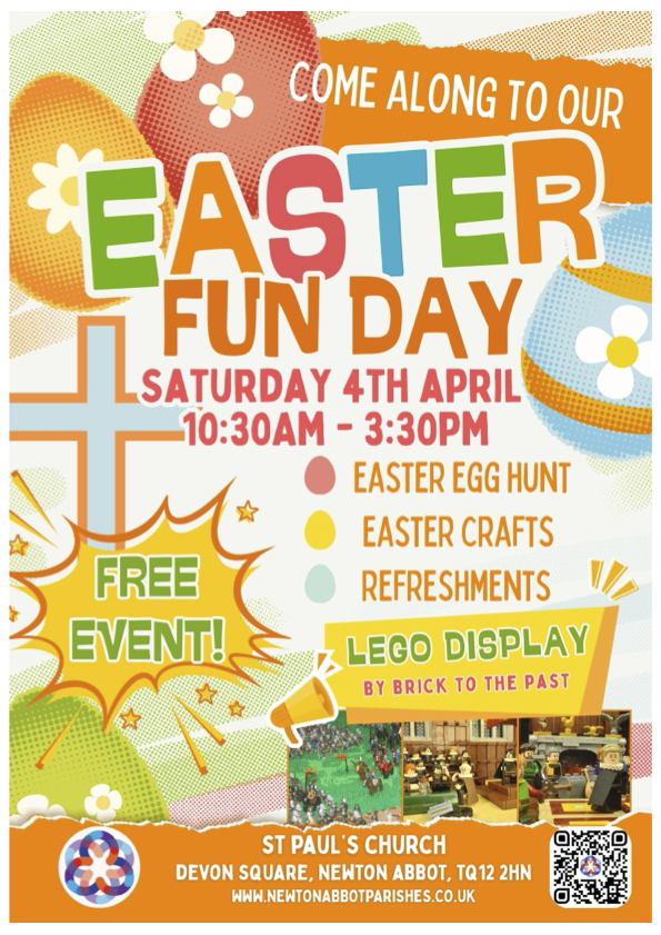Easter Egg Hunt, Easter Crafts, Refreshments, Lego Display – all free – St. Paul’s, Devon Square. (see poster below)